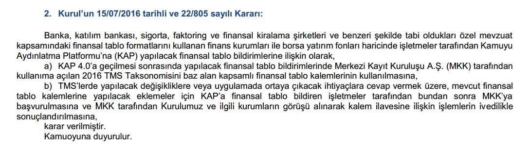 Sermaye Piyasası Kurulu'nun finansal raporlamalara ilişkin 15.07.2016 tarihli ve 22-805 sayılı İlke Kararı